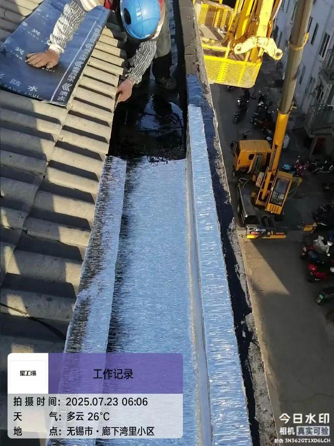 施工负责人介绍,此次修缮并非“简单修补”,而是要“治根治本”解决问题:首先对屋顶天沟进行屋面涂膜防水、屋面卷材防水维修,随后对墙面开展防水层拆除、外墙涂料面铲除、墙面涂膜防水、墙面喷刷涂料等一系列维护工作。